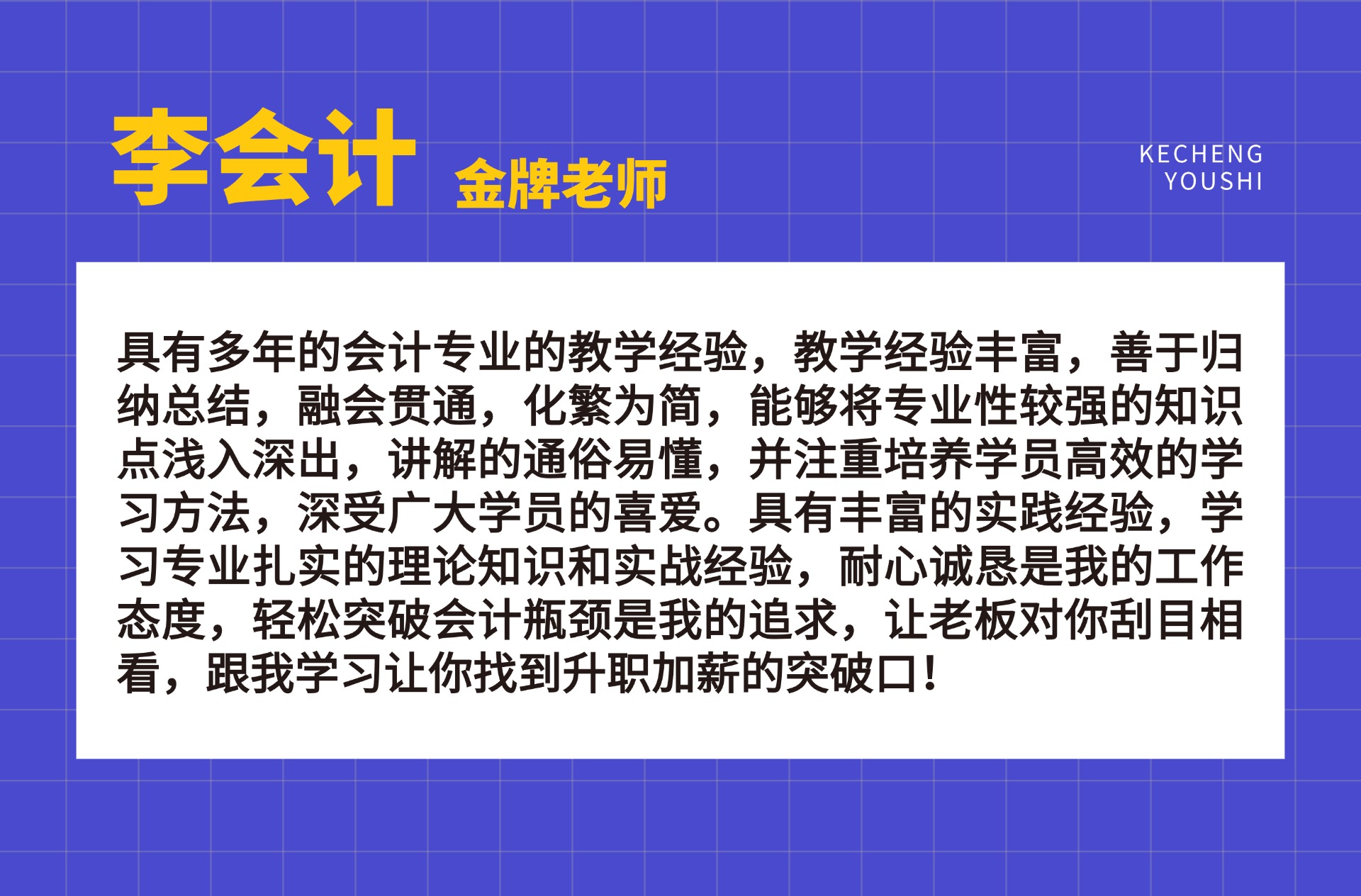 金牌讲师。具有多年的会计专业的教学经验,教学经验丰富,善于归纳总结,融会贯通,化繁为简,能够将专业性较强的知识点浅入深出,讲解的通俗易懂,并注重培养学员高效的学习方法,深受广大学员的喜爱。具有丰富的实践经验,学习专业扎实的理论知识和实战经验,耐心诚恳是我的工作态度,轻松突破会计瓶颈是我的追求,让老板对你刮目相看,跟我学习让你找到升职加薪的突破口!