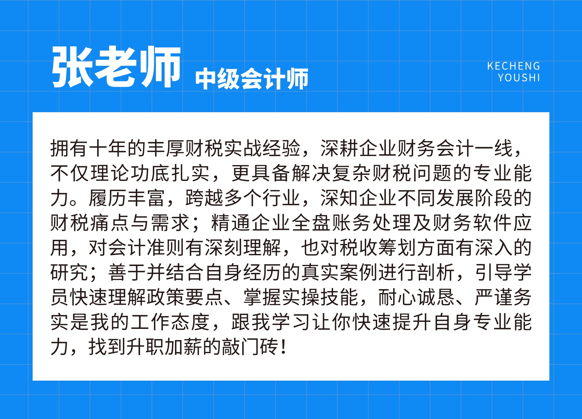 中级会计师,拥有十年的丰厚财税实战经验,深耕企业财务会计一线,不仅理论功底扎实,更具备解决复杂财税问题的专业能力。履历丰富,跨越多个行业,深知企业不同发展阶段的财税痛点与需求;精通企业全盘账务处理及财务软件应用,对会计准则有深刻理解,也对税收筹划方面有深入的研究;善于并结合自身经历的真实案例进行剖析,引导学员快速理解政策要点、掌握实操技能,耐心诚恳、严谨务实是我的工作态度,跟我学习让你快速提升自身专业能力,找到升职加薪的敲门砖!